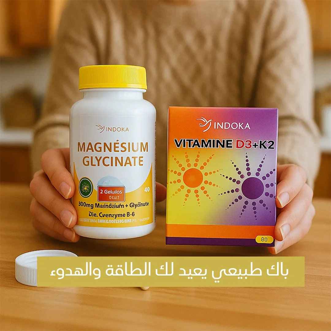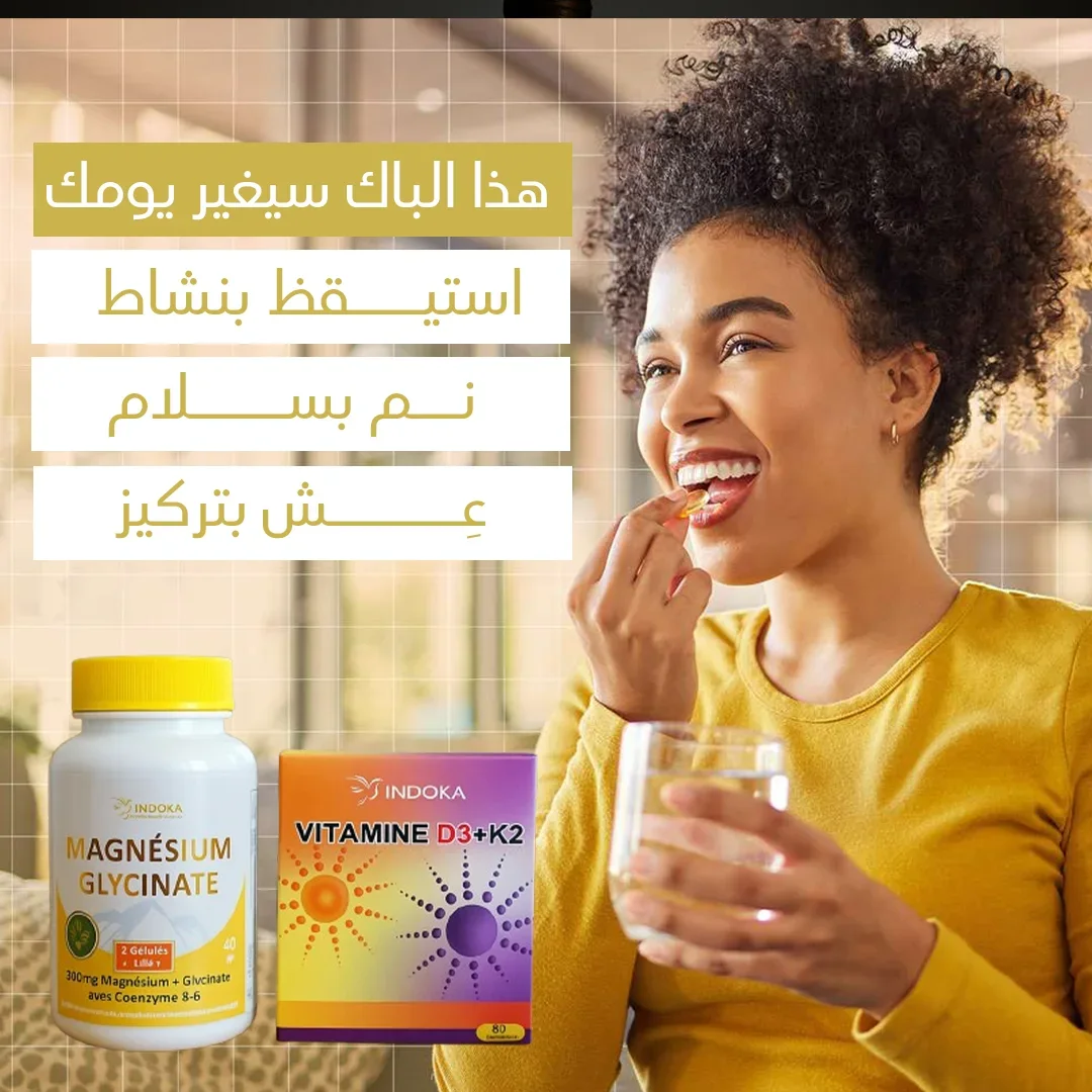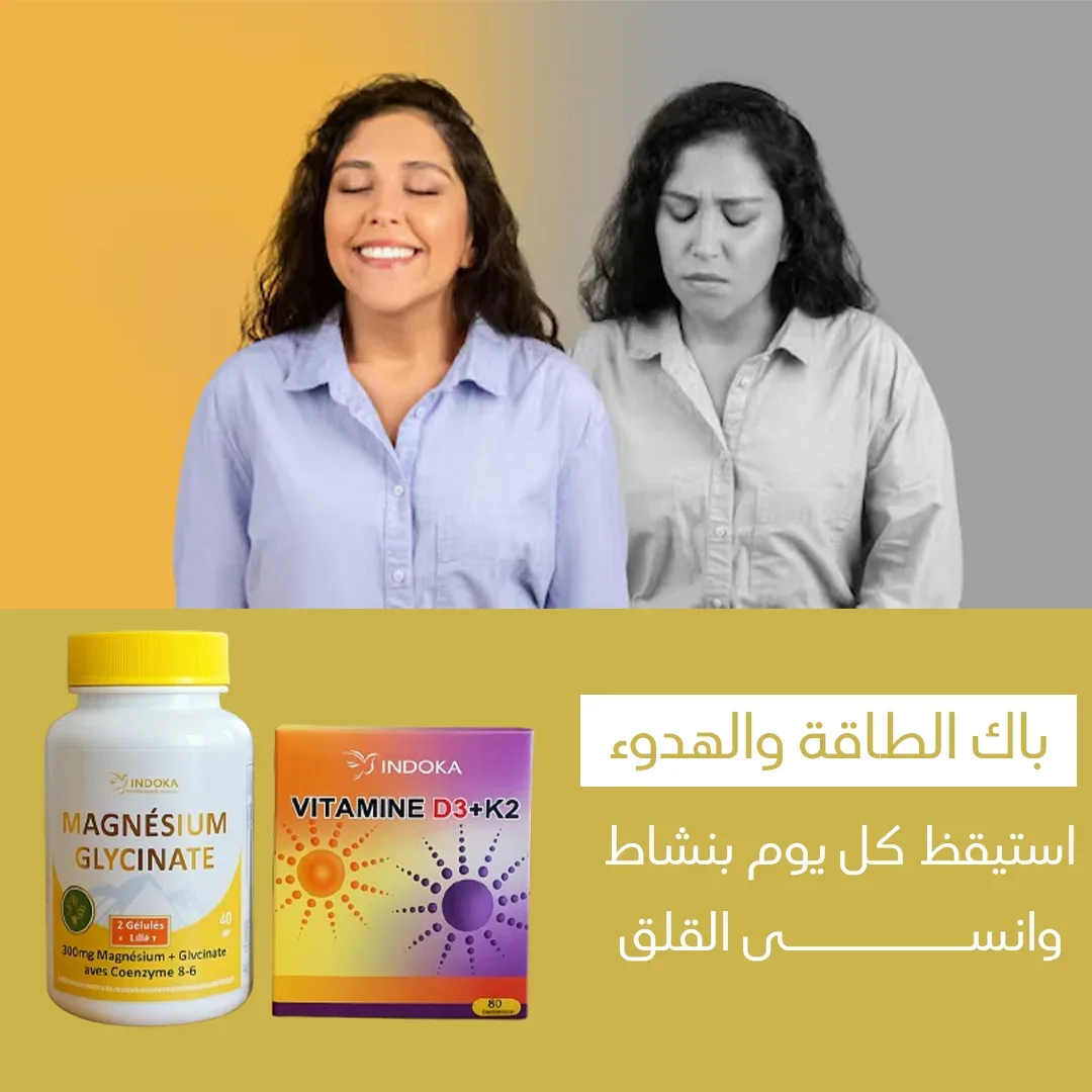 "باك 'الطاقة والهدوء' هو اختصار لحياة أكثر توازناً! 🌟 مع هذا المزيج الفريد من فيتامين D3+K2 وجليسينات المغنيسيوم، ستحصل على حلول طبيعية لمشاكل العصر - من الإرهاق اليومي إلى الأرق المزعج